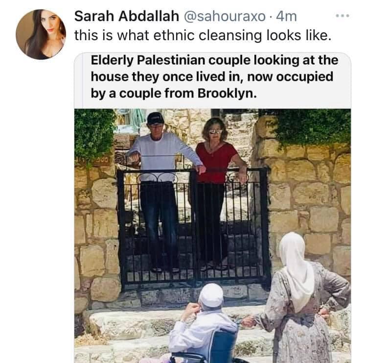 We rate the claim that a photo shows an elderly Palestinian couple in front of their old home, talking with a couple from Brooklyn as MISSING CONTEXT, because without additional information it could be misleading. Since the image was shared following recent violence between Hamas and Israel, many social media users assumed the image showed a recent eviction of the Palestinian couple. While it is correct that the couple once lived there, the seizure of their home and village happened in 1948, not recently. Reporting from Al Jazeera confirmed the other couple in the photograph are the current residents of the home, but there is no evidence they are from Brooklyn.